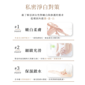 一款專為私密肌設計的嫩白保養身體乳 ✨全身肌膚皆適用✨ 敏弱肌、孕婦皆可安心使用 🚫無酒精 🚫無精油 🚫無致敏成份 用途:私密處肌膚保濕、嫩白、撫平細紋及角質柔軟(全身亦適用) 用法:每次按壓2下,塗抹於肌膚並按摩至吸收 容量:100ml 產地:台灣 重量 不提供 容量 100ml, 300ml